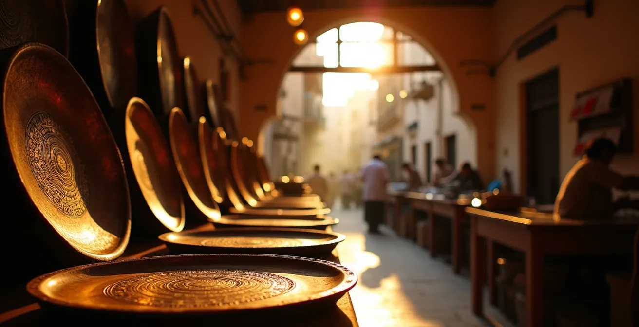 Dans les ruelles du souk El Nhas de Tunis, le martèlement des dinandiers résonne comme le pouls de la ville. Plateaux, théières et lanternes brillent de mille feux, mais tous les éclats ne se valent pas. La distinction fondamentale se joue entre le cuivre rouge, pur et noble, et le laiton, un alliage de cuivre et de zinc d’un jaune doré. Le choix dépend de l’usage : le cuivre rouge, excellent conducteur de chaleur, est traditionnellement privilégié pour les ustensiles de cuisson comme les « kaskas » (couscoussiers). Le laiton, plus dur et résistant à la corrosion, est parfait pour les objets décoratifs, les plateaux de service ou les appliques murales qui doivent conserver leur brillance.