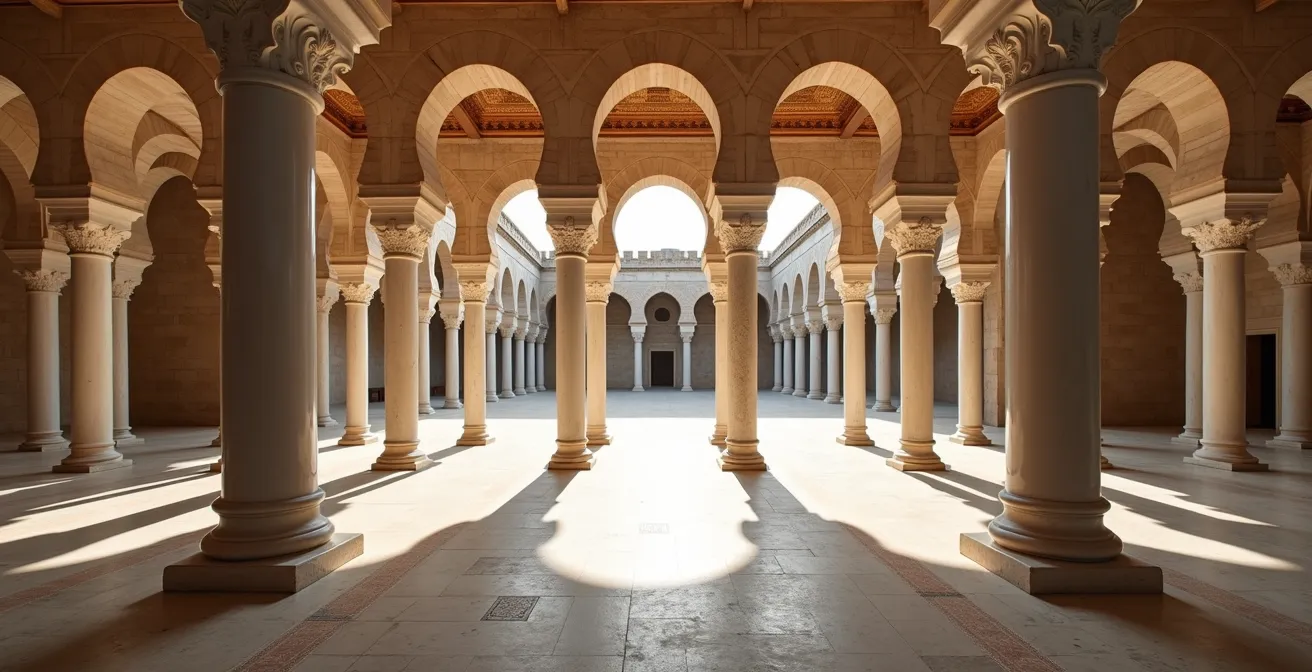 En parcourant la salle de prière de la Grande Mosquée de Kairouan (l’une des rares accessibles, sous conditions), un détail frappe le visiteur attentif : la forêt de colonnes qui soutient le toit est un assemblage hétéroclite. Des chapiteaux corinthiens côtoient des fûts de marbre rose et de granit gris, créant une harmonie surprenante à partir d’éléments disparates. Ce phénomène, loin d’être anecdotique, est un principe architectural clé de nombreuses constructions islamiques anciennes, connu sous le nom de spolia ou réemploi.